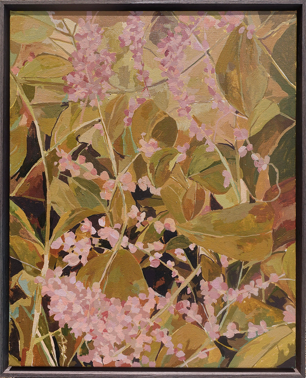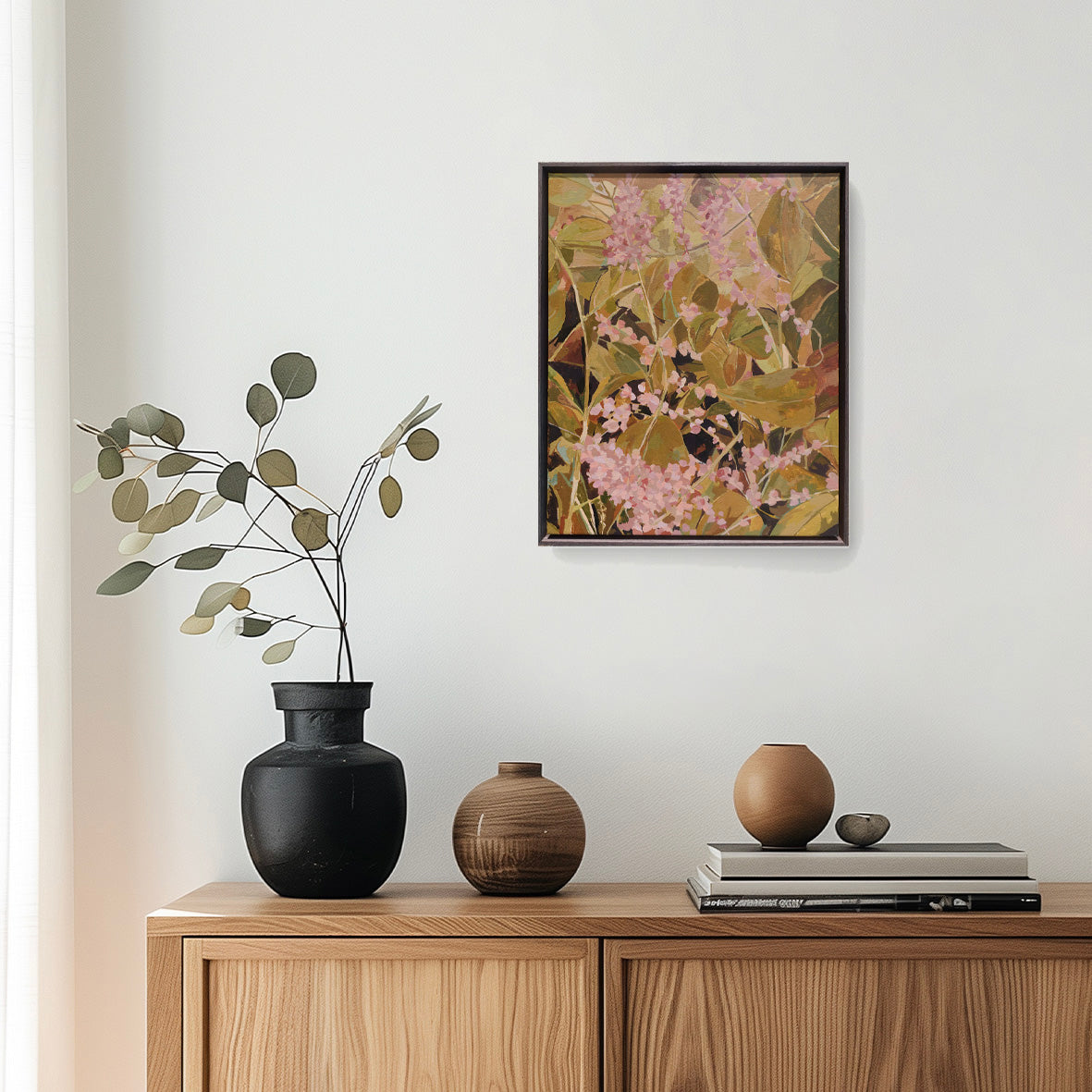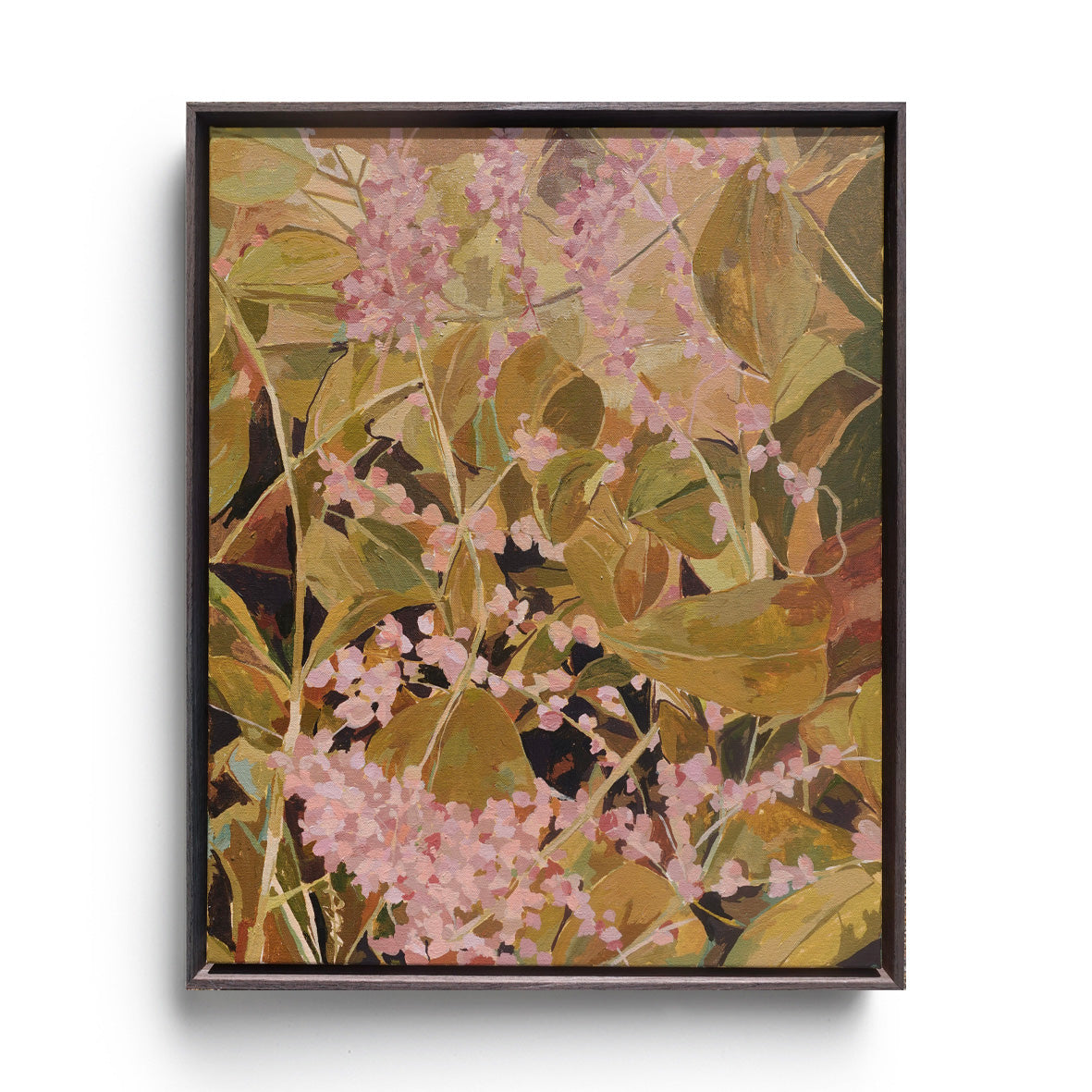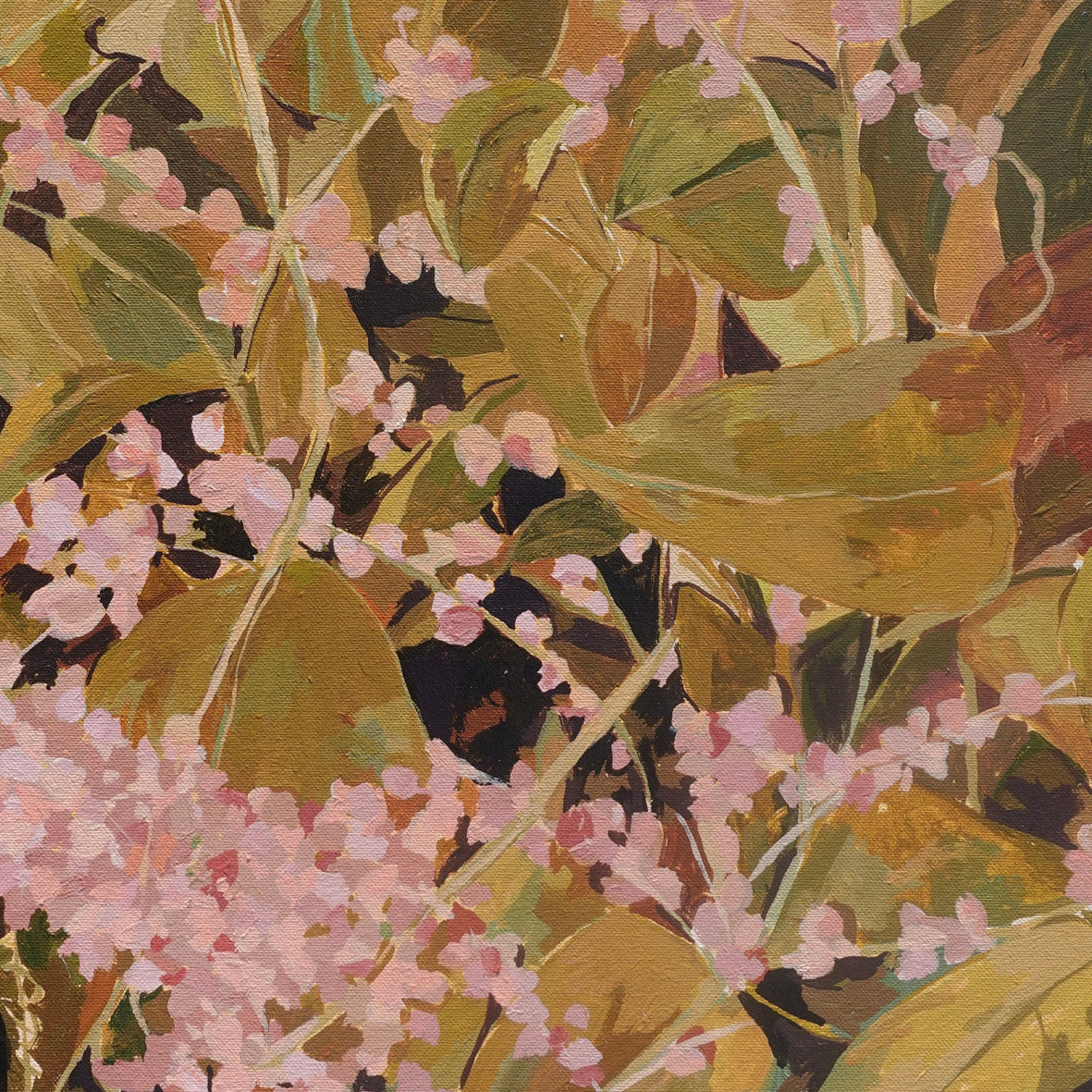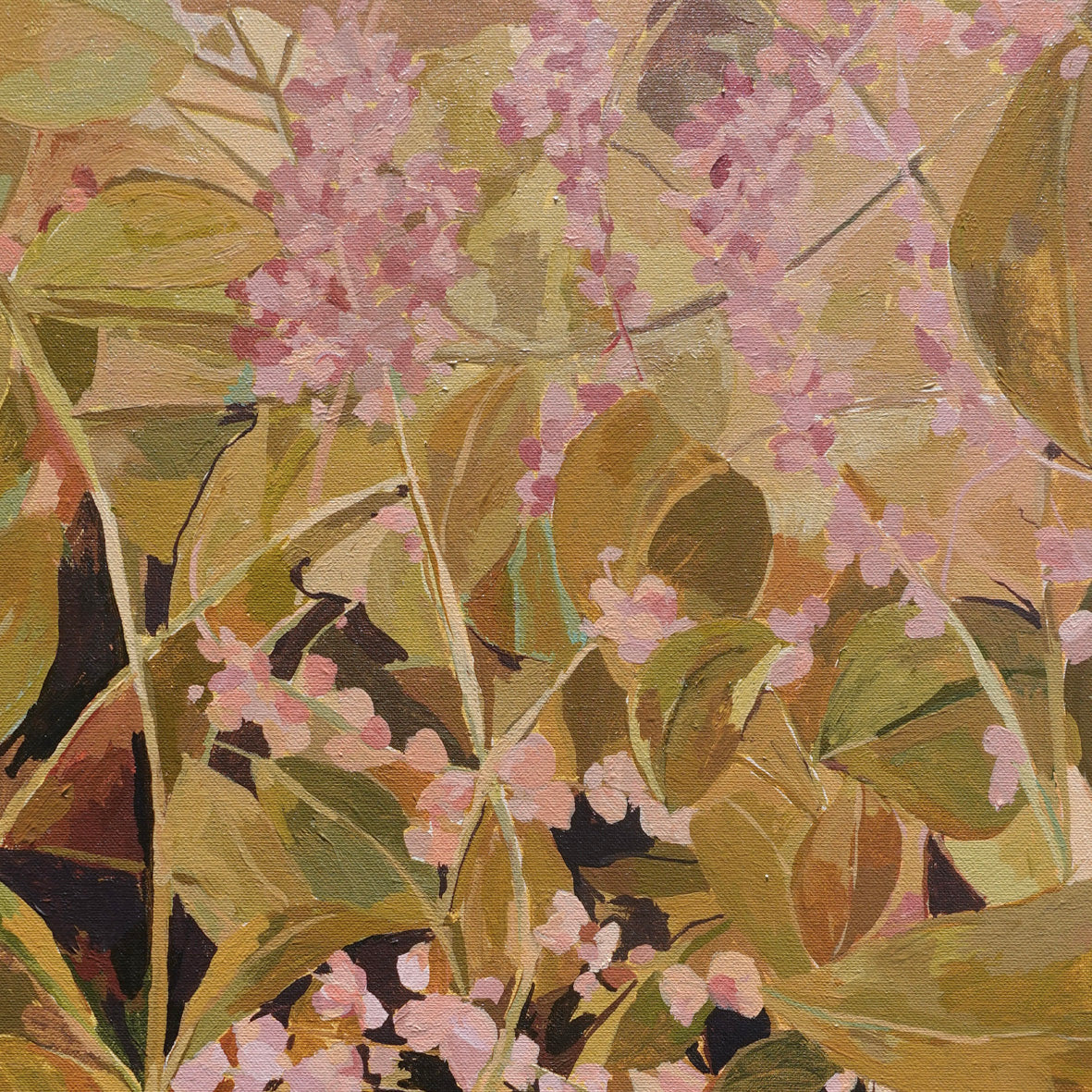 Hand painted, original artwork by Anna Walsh. Inspired by flowering creeper vines reminiscent of wisteria and bougainvillea in warm olive tones. Golden tones layered with greens, pinks and purples.