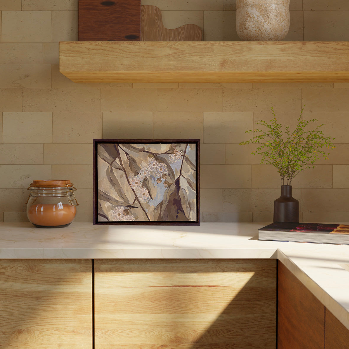 Hand painted, original artwork by Anna Walsh. Featuring flowering gum, gum nuts and gum leaves in tones reminiscent of Australian eucalypt.