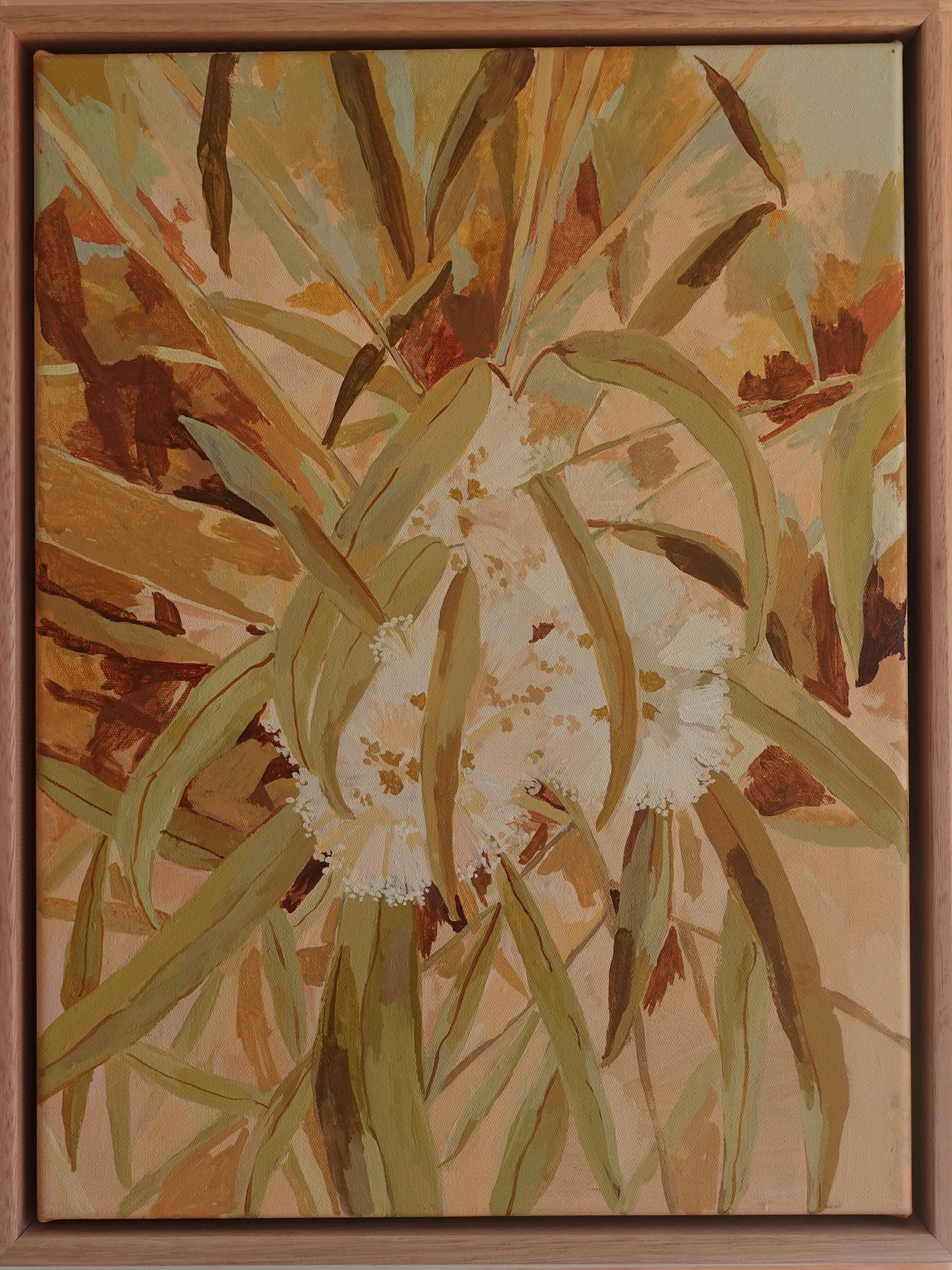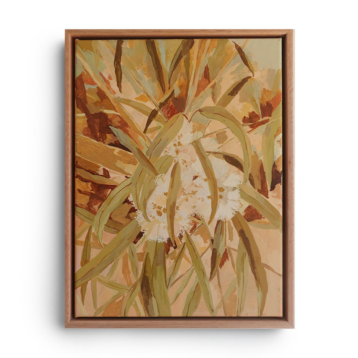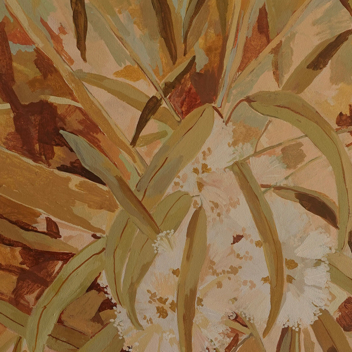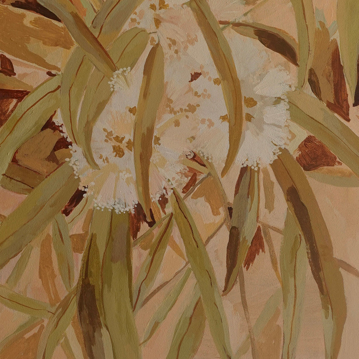 Hand painted, original artwork by Anna Walsh. An abstract study of white flowering gum amidst soft pinks, browns and blue