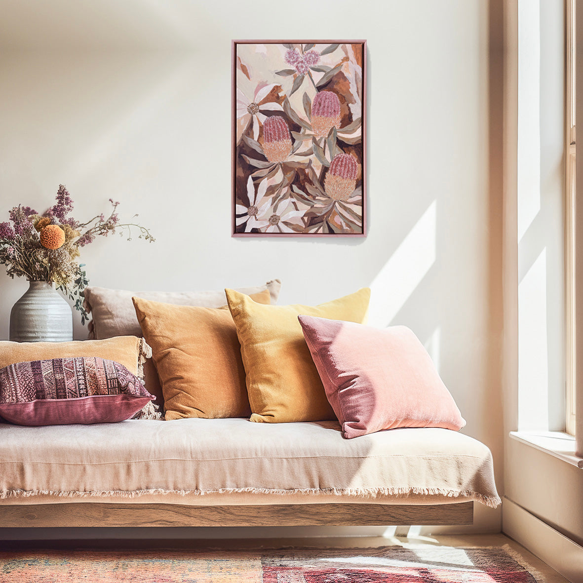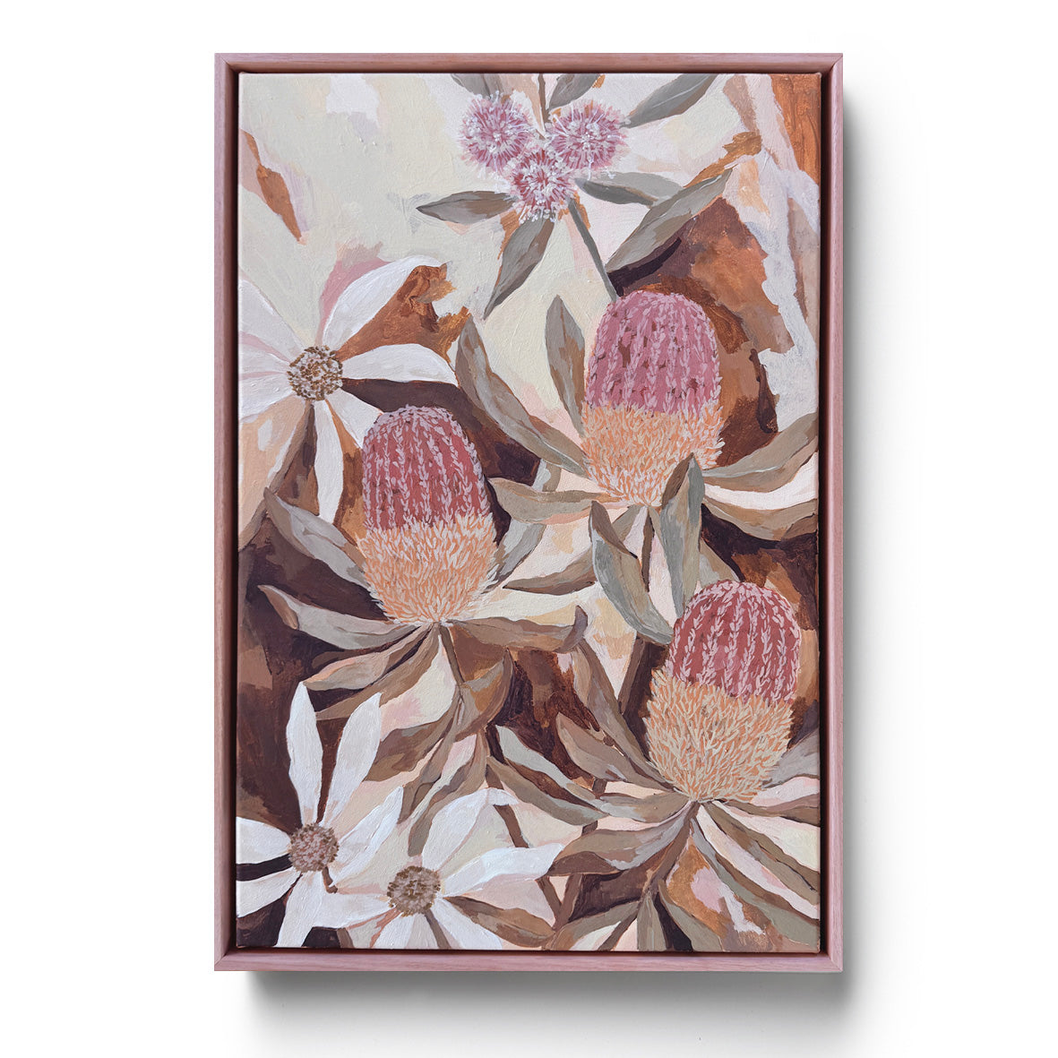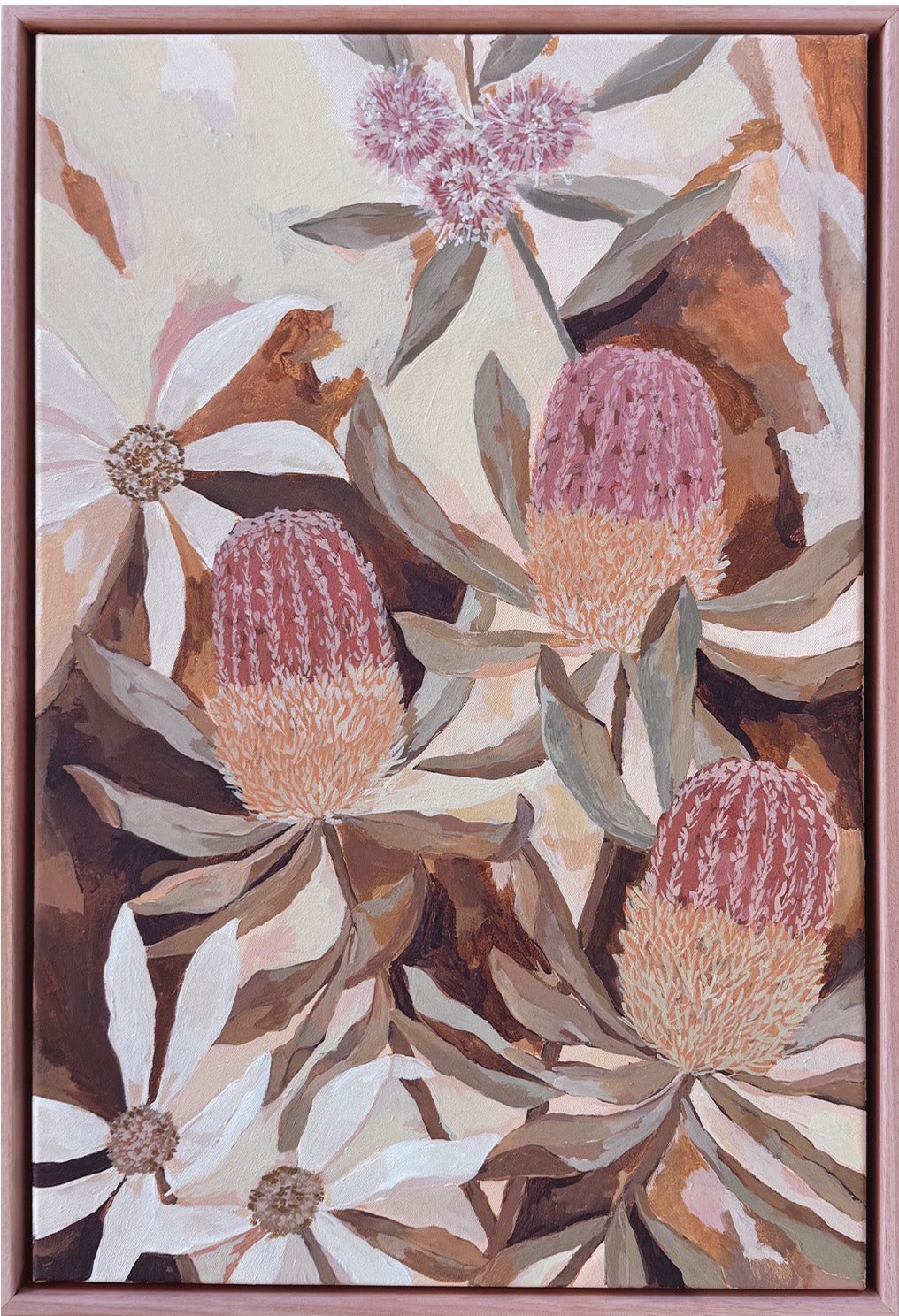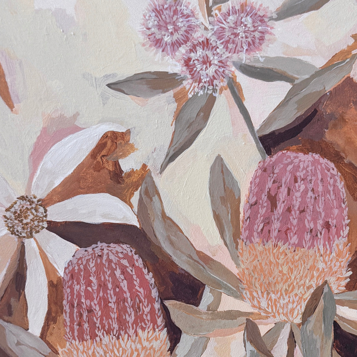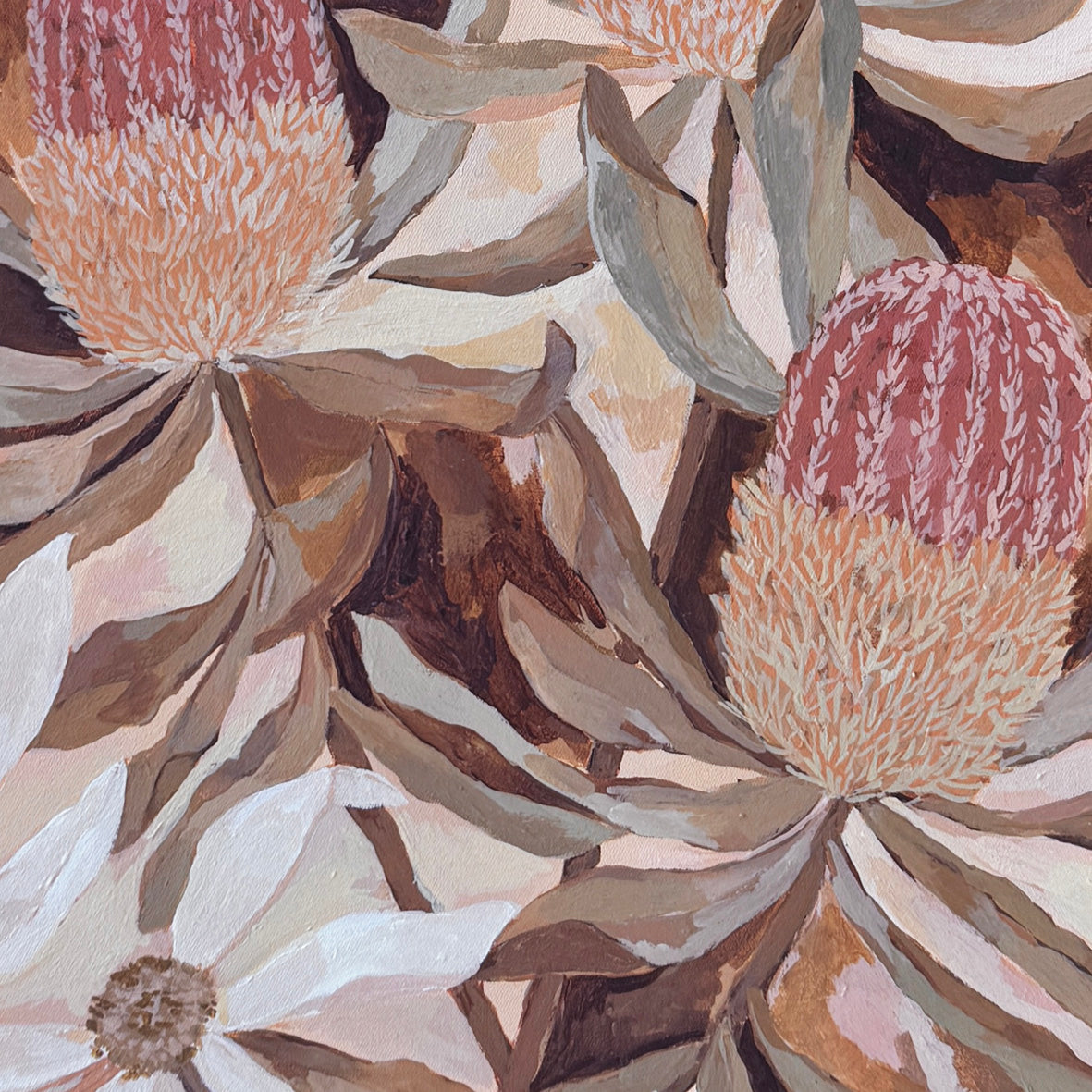 Hand painted, original artwork by Anna Walsh. Featuring banksia, flannel flowers and hakea in warm whites, rusts, pinks and deep yellow.