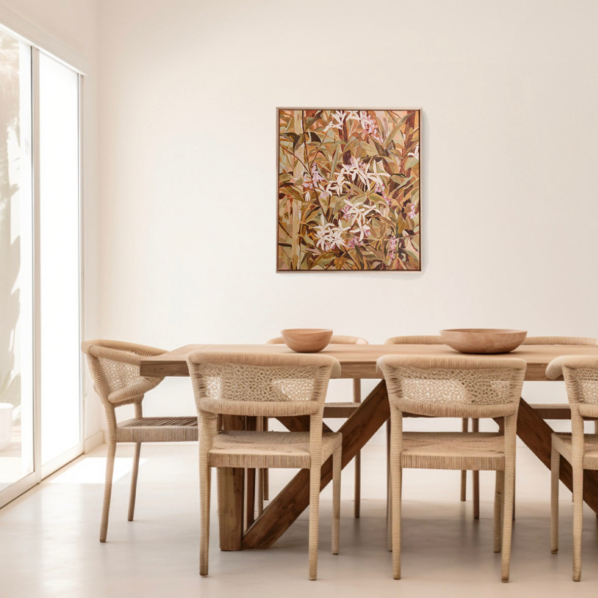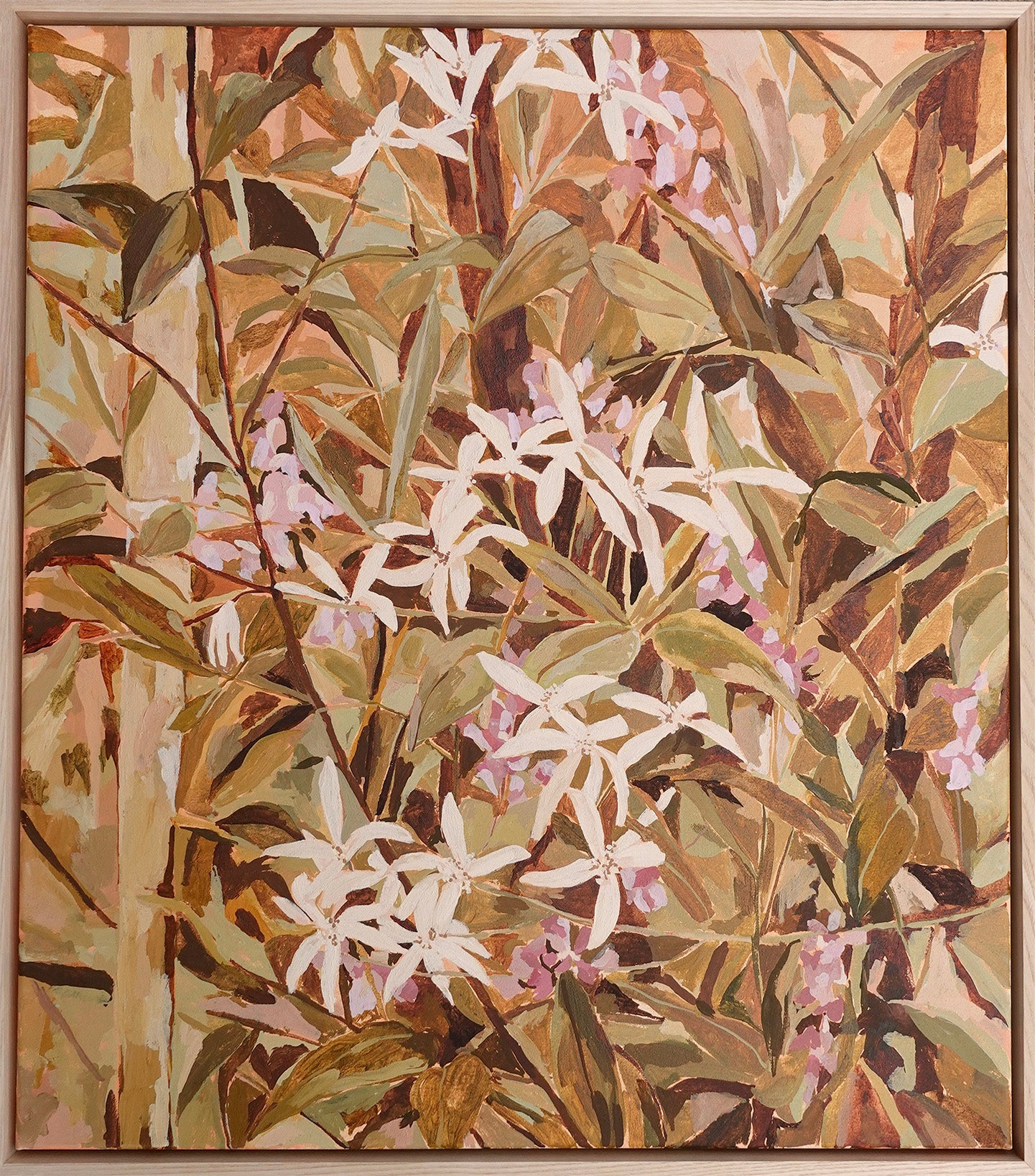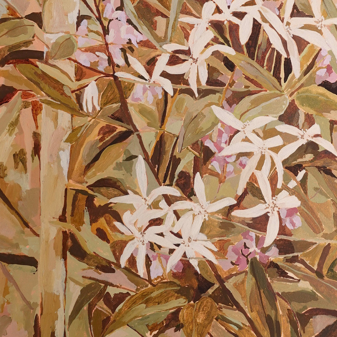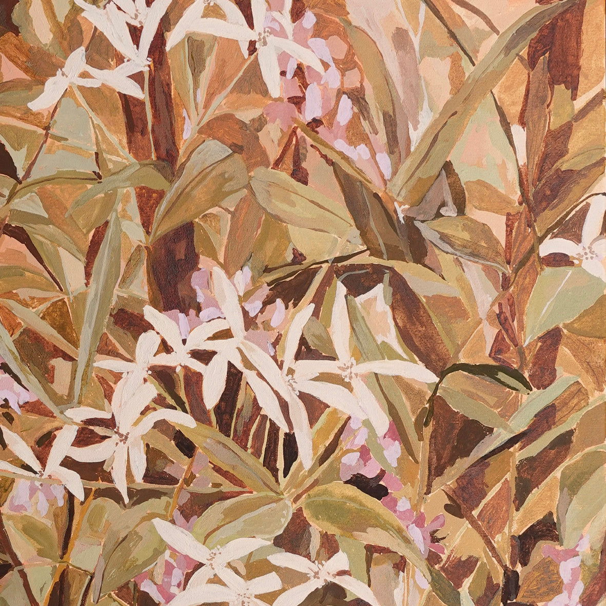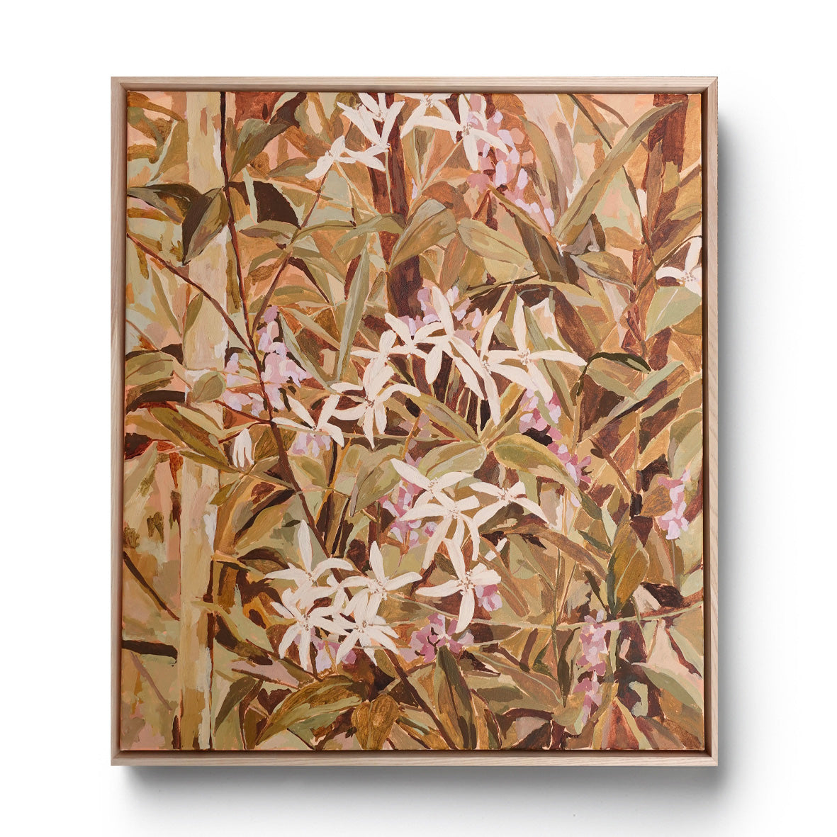 Hand painted, original artwork by Anna Walsh. Inspired by a vintage photograph of white clematis and native blue wisteria in Western Australia, this piece reminds me of my son who loves asking 'lets go for a wramble in the forest'. Golden tones layered with greens and pinks.