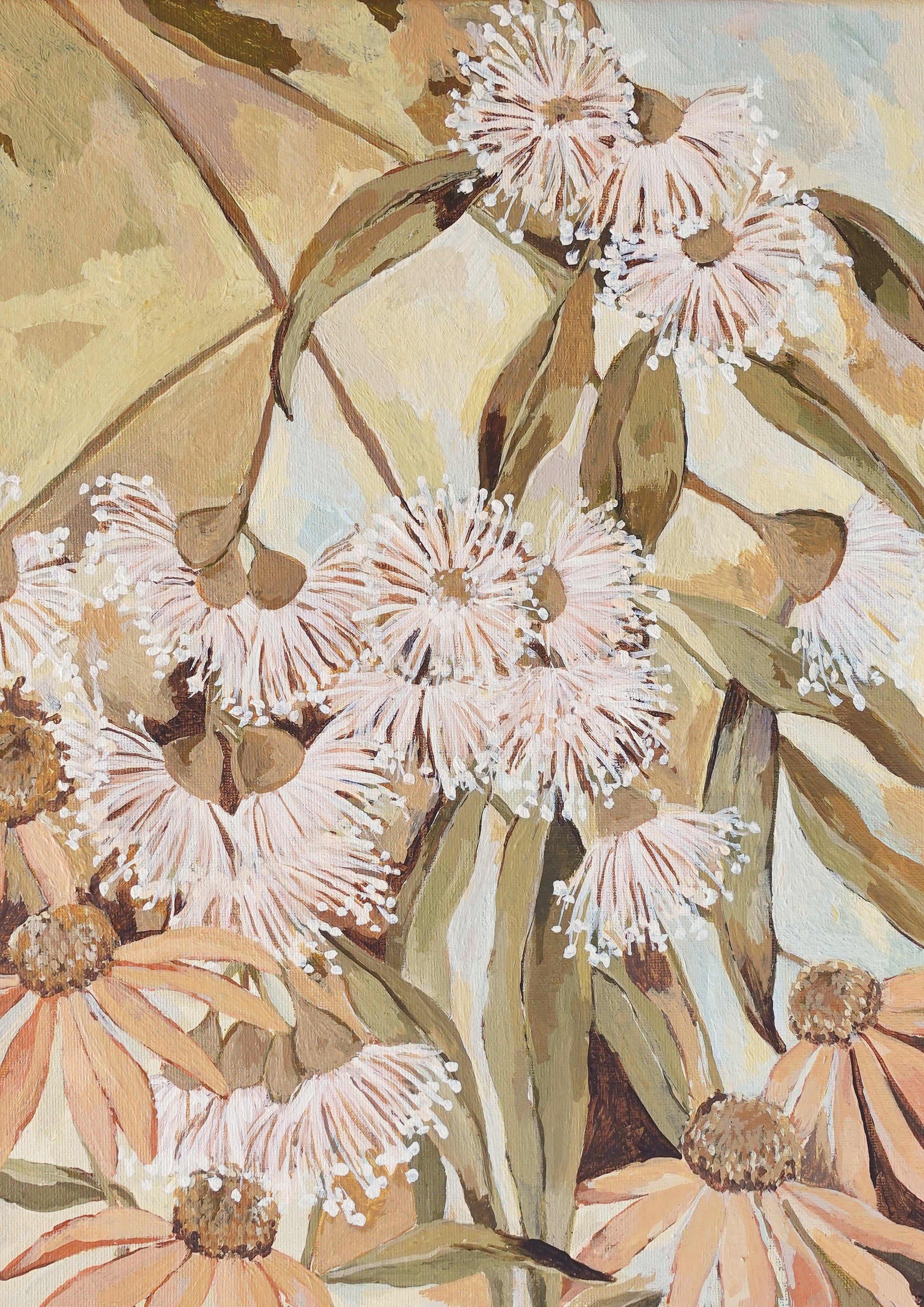 Featuring gum blossom and echinacea 'Aftersun' is a reproduction of an original acrylic on canvas artwork hand painted by Anna Walsh.